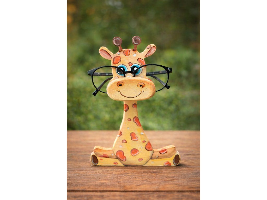 Ručně malovaný dřevěný stojánek na brýle ve tvaru žirafky hlídá brýle, aby se neztratily ani nepoškrábaly.