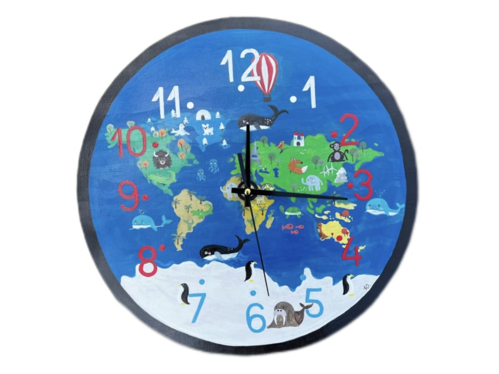 Dřevěné, ručně malované hodiny s tichým chodem. Velikost 33 cm.